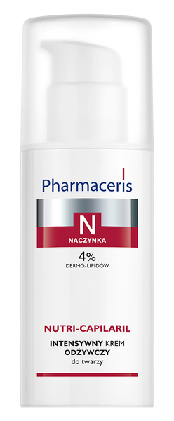 Bogata formuła preparatu intensywnie odżywia i regeneruje skórę, zmniejszając uczucie suchości, łuszczenia i szorstkości. Zawartość 4% naturalnych dermo-lipidów, w tym masła Shea oraz specjalnej frakcji lanoliny wzmacnia naturalną barierę ochronną skóry zapobiegając odwodnieniu naskórka. Wykorzystana w recepturze mikronizowana diosmina wzmacnia naczynka krwionośne zwiększając ich elastyczność i odporność na czynniki zewnętrzne. Skutecznie redukuje istniejące zaczerwienienia oraz zapobiega powstawaniu nowych zmian rumieniowych. Dzięki zawartości witaminy E krem przyspiesza naturalny, wewnętrzny proces odbudowy komórek wygładzając i uelastyczniając skórę. Działa łagodząco i kojąco zmniejszając podatność skóry na podrażnienia. Szybko się wchłania, dobrze rozprowadza, polecany jako baza pod makijaż. SPOSÓB UŻYCIA: Przygotować skórę do nałożenia kremu oczyszczając ją preparatem z serii Pharmaceris N. Następnie rozprowadzić krem na skórze twarzy i szyi. Stosować codziennie rano i wieczorem. SKŁADNIKI AKTYWNE: Diosmina - wzmacnia ścianki naczynek krwionośnych, zapobiega ich pękaniu oraz zabezpiecza przed uszkodzeniem. Witamina E - tzw. witamina młodości o silnym działaniu przeciwutleniającym, chroni przed wolnymi rodnikami i niekorzystnymi czynnikami zewnętrznymi. Redukuje zmarszczki oraz nawilża i przyspiesza proces regeneracji i odbudowy skóry. Masło Shea - naśladuje strukturą naturalną lipidową osłonę skóry, działa łagodząco i odżywczo na naskórek. Zmniejsza tendencję do rumienia i pojawiania się nowych naczynek. Podmiot odpowiedzialny za ten produkt na terenie UE