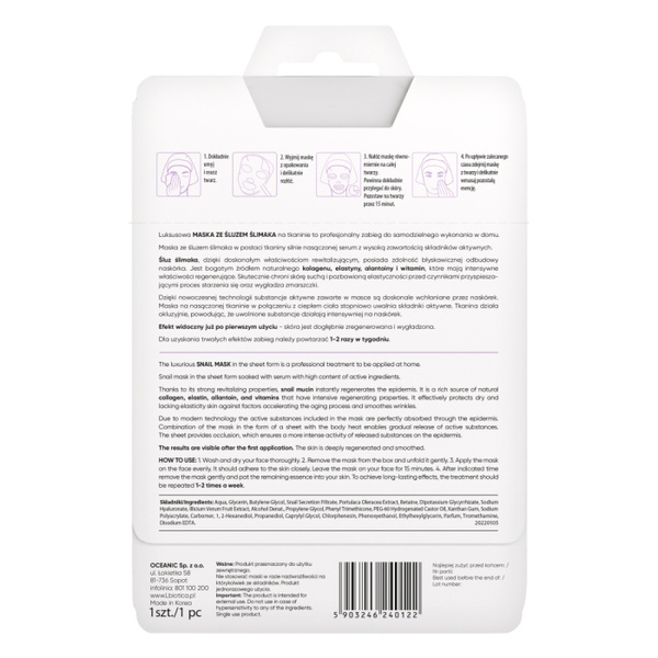 - Maska ze śluzem ślimaka w postaci tkaniny silnie nasączonej serum z wysoką zawartością składników aktywnych.