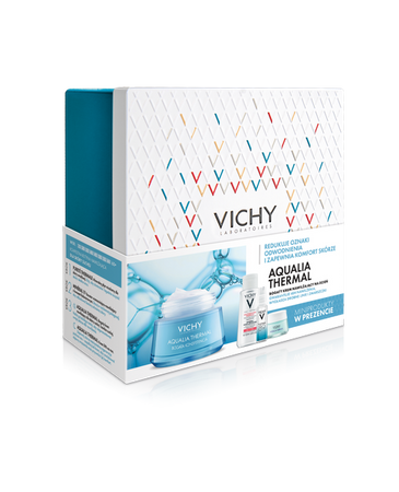 - Nawilżający zestaw świąteczny Vichy składający się z kremu AQUALIA THERMAL o bogatej konsystencji oraz 3 mini produktów w prezencie uzupełniających codzienną pielęgnację. Redukuje oznaki odwodnienia i zapewnia komfort skórze. Odpowiedni dla suchej skóry.
