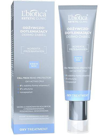 ODŻYWCZO-DOTLENIAJĄCY DERMO-ZABIEG to krem o bogatej konsystencji do stosowania na noc. Łączy w sobie nowatorską, opatentowaną technologię CELL TECH RENO-PROTECTOR® o potrójnym działaniu oraz optymalne stężenie witaminy C o potwierdzonej skuteczności antyoksydacyjnej. Dzięki stabilnej formie intensywniej działa na głębsze warstwy naskórka, rozjaśniając przebarwienia oraz aktywnie stymulując syntezę kolagenu. Zaawansowana formuła kremu z dotleniającym OXY ACTIVE CPLX doskonale odżywia i wpływa na procesy hamujące syntezę melaniny podczas nocnego rytmu odnowy skóry, dając widoczną poprawę kolorytu i rozjaśnienie zmian pigmentacyjnych różnego pochodzenia. Dzień po dniu skóra staje się odczuwalnie bardziej nawilżona i ujędrniona. Odzyskuje miękkość, jest rozświetlona i wygląda na wypoczętą.