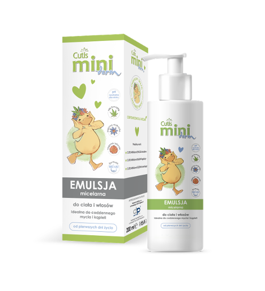 - Emulsja micelarna Cutis Mini Derm to emolient trzech generacji plus – aktywny emolient – stworzony z myślą o codziennym myciu lub kąpieli skóry i włosów dziecka już od pierwszych dni życia.