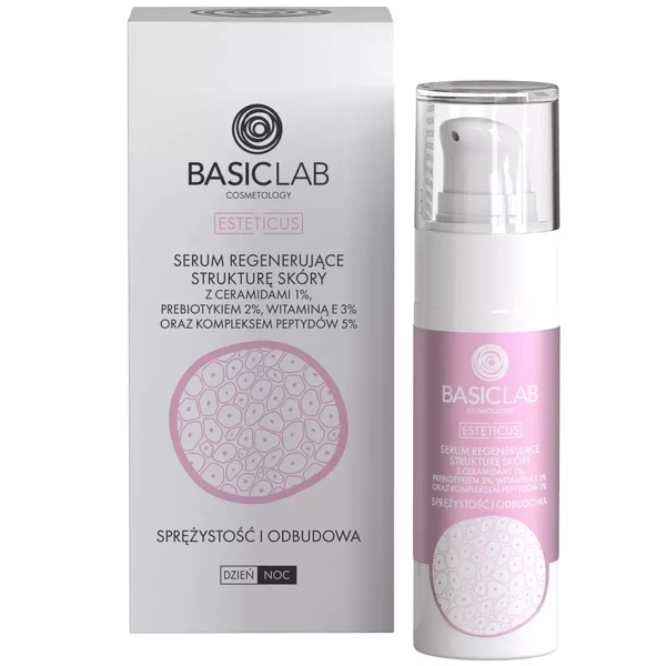 BasicLab Serum regenerujące strukturę skóry z ceramidami 1% i kompleksem peptydów 5% sprężystość i odbudowa, 30 ml z pompką