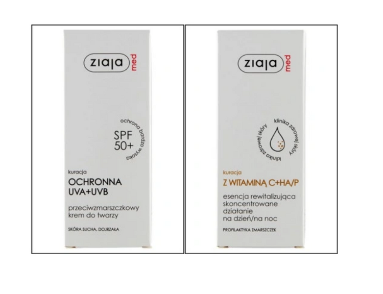 Ziaja Med kuracja ochronna UVA+UVB przeciwzmarszczkowy krem do twarzy, 50ml + Kuracja z wit.C esencja rewitalizująca 30 ml │ Data ważności 03/2026 │