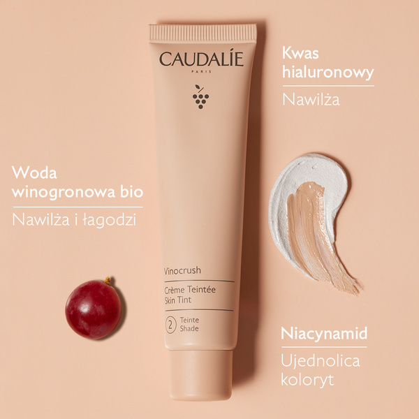 - Lekki krem koloryzujący Caudalie Vinocrush (odcień 2) wyrównuje koloryt, nawilża i nadaje cerze naturalny blask. Idealny dla bardzo jasnej skóry. Wegańska formuła, 96% składników naturalnych.