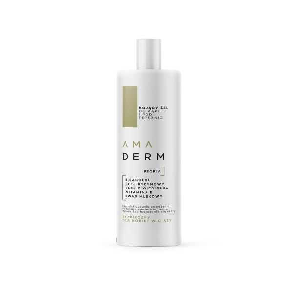 - Amaderm Psoria – kojący żel do kąpieli i pod prysznic. Łagodnie myje, nawilża i koi skórę suchą oraz problematyczną, zmniejszając uczucie świądu.