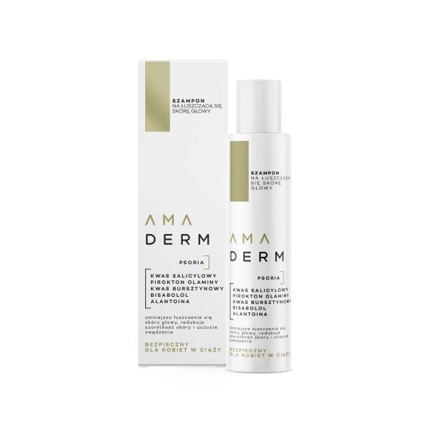- Amaderm Psoria – szampon do skóry głowy z łuszczycą i skłonnością do podrażnień. Redukuje łuszczenie, koi i wspiera regenerację, przywracając włosom zdrowy wygląd.