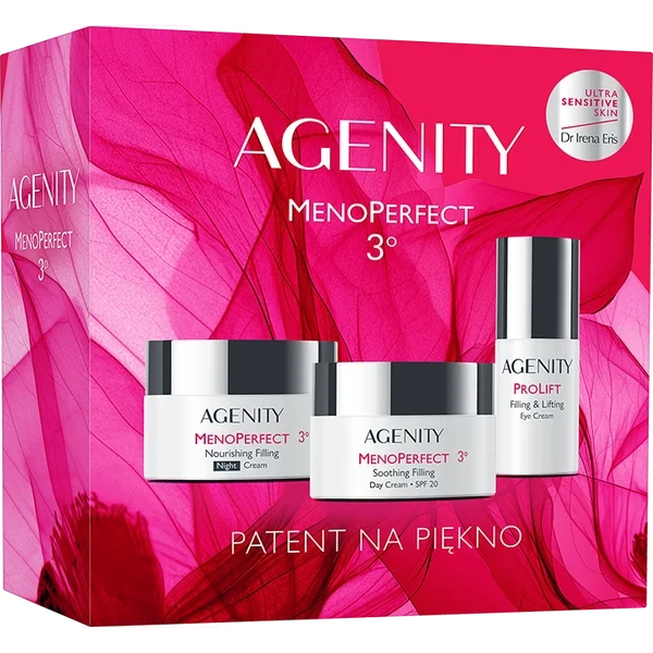 - Agenity Menoperfect 3° to kompletny zestaw pielęgnujący skórę dojrzałą – szczególnie tę, która przechodzi przez okres menopauzy. Krem na dzień SPF 20 chroni i wygładza, krem na noc odżywia i odbudowuje, a krem pod oczy redukuje zmarszczki i cienie.