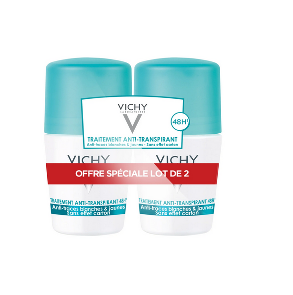 - Antyperspirant Vichy przeciw śladom 48h w praktycznym duopaku. Skuteczna ochrona przed potem oraz ochrona ubrań przed białymi i żółtymi przebarwieniami. Odpowiedni dla skóry wrażliwe